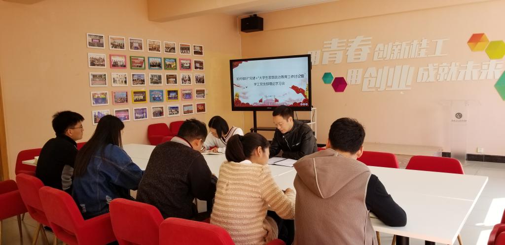 为更好的贯彻落实党的十九大精神,创新学院学生思想政治教育工作理念、思路和方法,提升工作实效。11月27日下午,学院学工党支部在7401教室开展“党建+”大学生思想政治教育工作研讨会暨理论学习会。会议由学工党支部书记周章明老师主持。