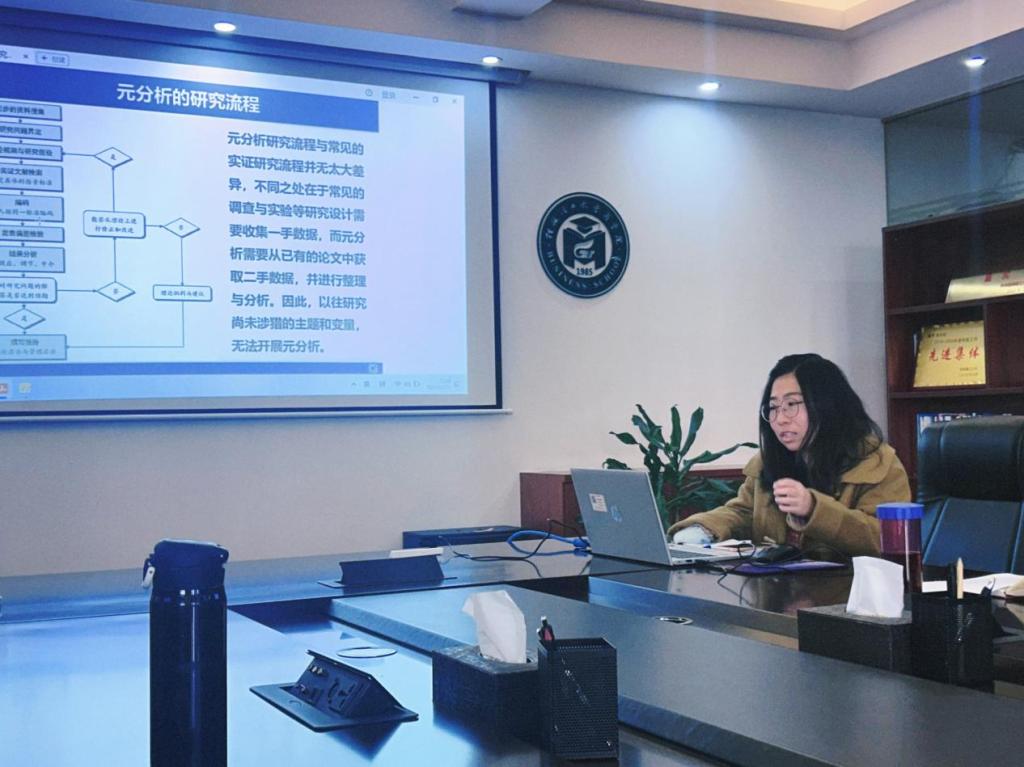 会议由教研室主任覃燕老师主持,会上贺琦博士做了《组织管理研究中的纵向元分析》的主题报告,就组织管理研究中交叉滞后元分析的原理以及文献示例进行了详细讲解。随后参会老师们围绕研讨会主题内容进行了积极的交流探讨。最后卢副院长对本次研讨会进行了总结,对老师们的积极参与教学科研研讨活动表示肯定,并鼓励老师们积极申报国家、省部级项目。