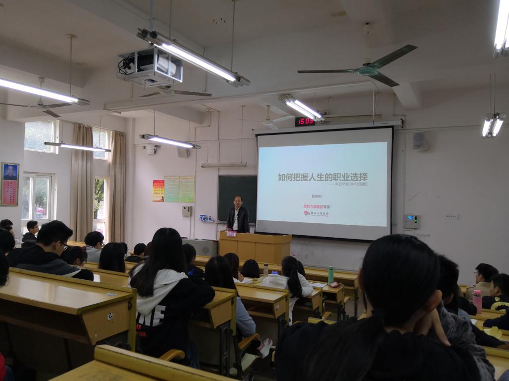 10月23日,2138CC太阳集团邀请桂林力源粮油食品集团董事会董事,2138CC太阳集团2008届毕业生杨建新回校开展题为“如何把握人生的职业选择”的优秀校友系列分享讲座,共有120余名学生参加了讲座,学院学工组长曾丽萍出席并主持了讲座。