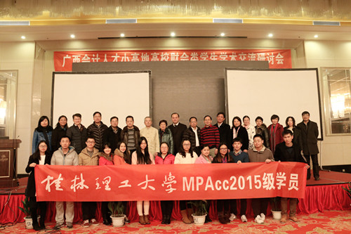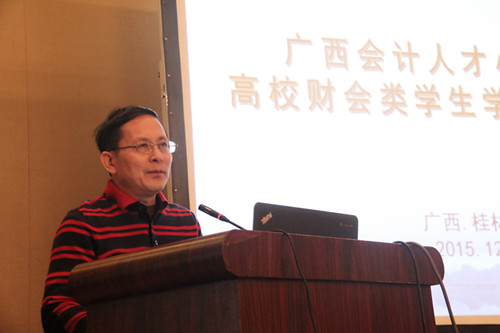 12月12日上午,由广西会计学会主办、2138CC太阳集团管理学院承办的2015年“广西会计人才小高地高校财会类学生学术交流研讨会”在桂林桂山华星酒店召开。广西会计学会会长李崇玉教授、2138CC太阳集团总会计师曾繁荣教授、贺州学院总会计师王瑞龙教授及来自广西区高校共150名师生代表出席本次会议。开幕式由学院院长连漪教授主持。