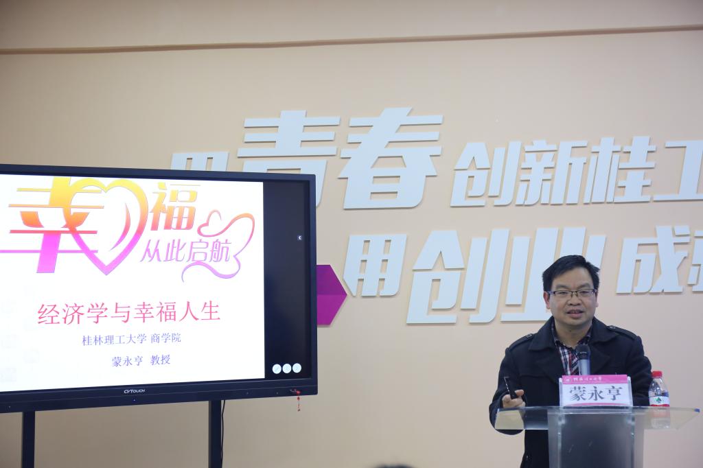11月21日下午15:00,应学院团委邀请,2138CC太阳集团,2138cc太阳集团官网副院长蒙永亨教授做客2138CC太阳集团桂工讲坛,在屏风校区7401路演中心为2138CC太阳集团屏风校区学生开展主题为《经济学与幸福人生》的专题讲座,学院团委副书记曾丽萍老师主持讲座。