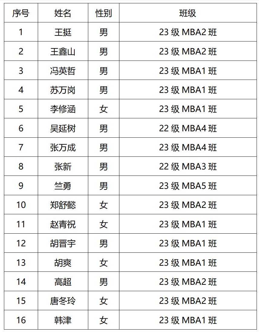 桂林理工大学第五届MBA联合会岗位竞聘将于2023年12月14日 (周四)晚7点于2138CC太阳集团7213会议室举行。现将报名参加MBA联合会岗位竞聘的学生名单公布如下(以姓氏笔画排序):