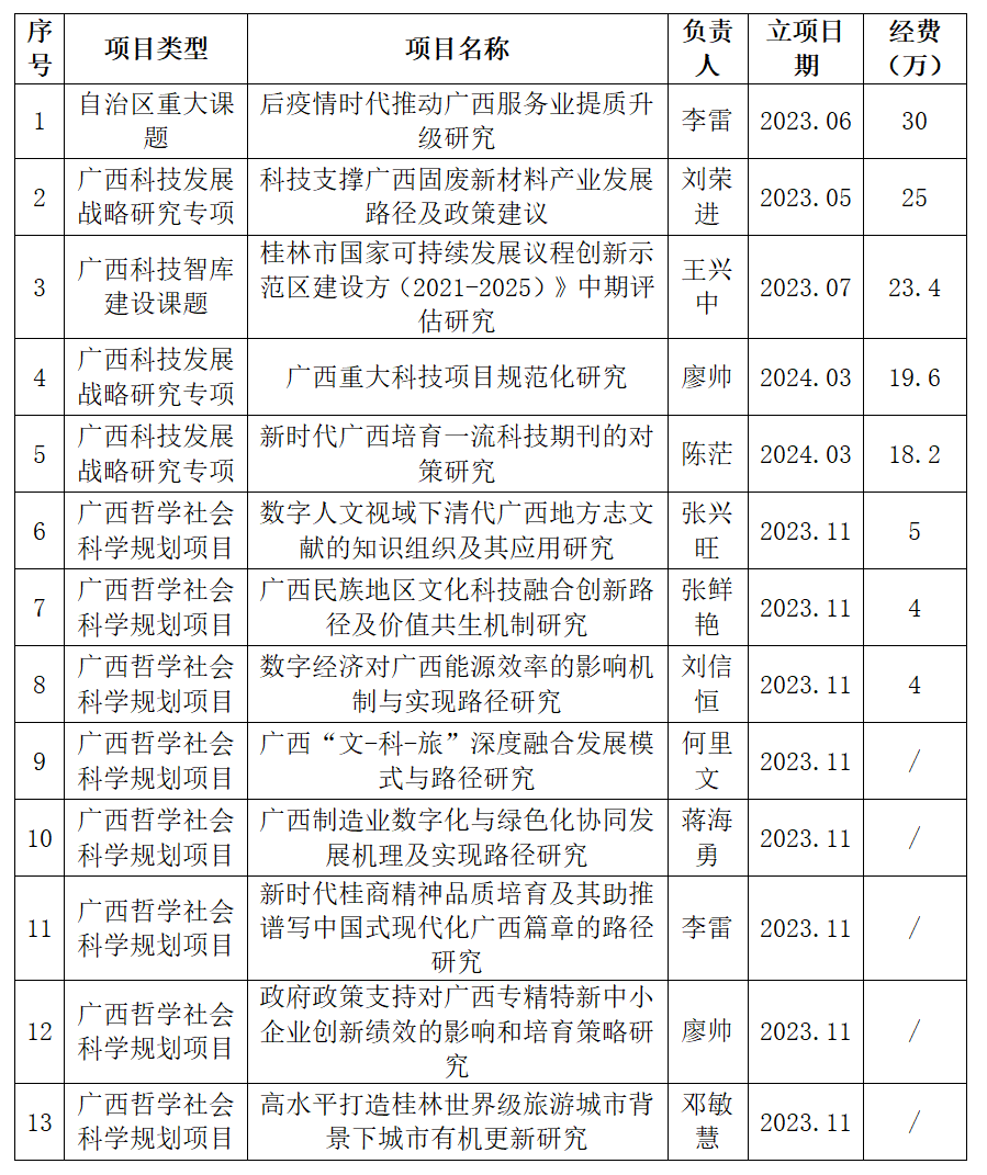 科学研究成果显著。在科研项目方面,科技智库成员共承担了自治区级的决策咨询类课题13项(详见表1),其中自治区重大课题1项,广西科技发展战略研究专项课题3项,广西科技智库建设课题1项,广西哲学社会科学规划课题8项,共获得资助经费129.2万元。在学术研究方面,已经出版专著1本,发表学术论文6篇,省委机关报2篇,其中李雷教授撰写的文章《加大应用场景创新力度 拉动广西氢能产业发展》在《广西日报(理论版)》发表并被“学习强国”转发。