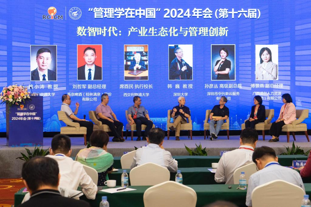 大会共设“实践探索”与“理论研究”两个栏目。在“实践探索”栏目,深圳市中兴新云服务有限公司高级副总裁孙彦丛、广西道尔人力资源(集团)有限公司副总经理傅景燕、燕京啤酒(桂林漓泉)股份有限公司副总经理刘哲君分别以《数智化时代的企业经营管理》《灵活用工数智化转型创新与实践》《数智驱动管理 打造最佳啤酒企业》为题作了分享,讲述新颖的管理故事,分享管理实践者的智慧与感悟。随后,邀请了上述三位管理实践者,以及席酉民教授、深圳大学管理学院韩巍教授、西安交通大学管理学院姚小涛教授,举行“业界学界圆桌会议”,深入探讨“数智时代:产业生态化与管理创新”。
