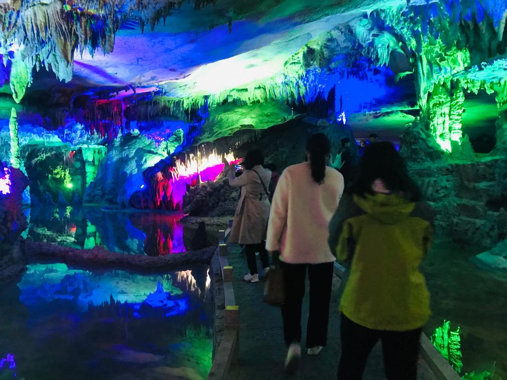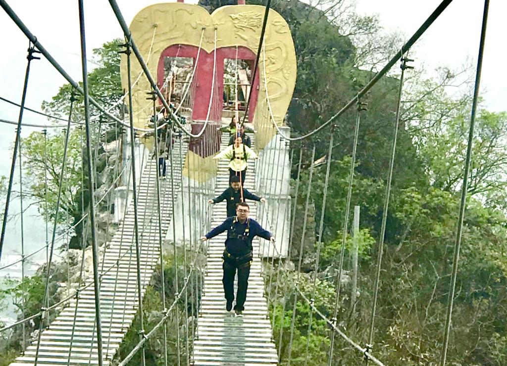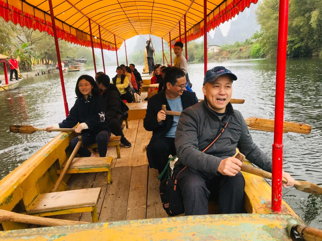 教职工们乘坐大巴将近2个小时到达荔江湾,一下车就被有着“水中水、山中山,桂林山水第一湾”美誉的荔江湾美景吸引住了。教职工们在导游的指引下,坐上上山的缆车,登上山顶的凤凰山玻璃观景台,迎着春风,将荔江湾的美丽乡村风貌一览无遗。走过弯弯曲曲的山边挂壁栈道,到达一座长约60米的“步步惊心”同心索桥和长约200米高空玻璃桥,教职工们克服恐惧,勇敢地挑战自己,留下“桂工人”的飒爽英姿!教职工们走过玻璃桥,顺着从旱滑道快速下山。山下的荔江风景如画,教职工们坐上游船欣赏着美丽的田园风光,观赏着鱼鹰捕鱼的盎然生趣,体验了击鼓划龙舟的江上乐趣,进入到天宫岩后感受了大自然鬼斧神工的杰作,美丽奇特的钟乳石和绚丽的水中倒影相映成趣。