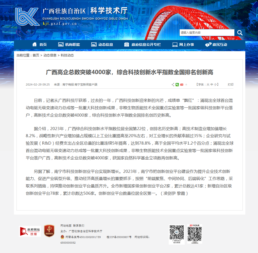 广西高企总数突破4000家,综合科技创新水平指数全国排名创新高
