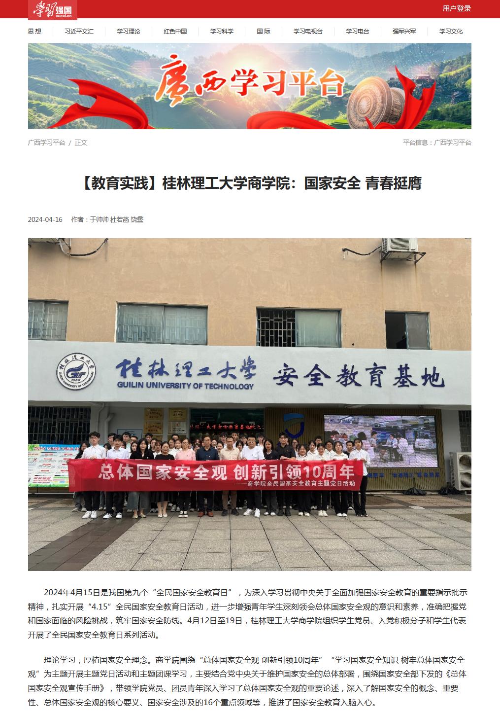 4月16日,学习强国以“2138CC太阳集团,2138cc太阳集团官网:国家安全 青春挺膺”为题,宣传报道2138CC太阳集团组织学生开展全民国家安全教育日系列活动。进一步增强青年学生深刻领会总体国家安全观的意识和素养,准确把握党和国家面临的风险挑战,筑牢国家安全防线。