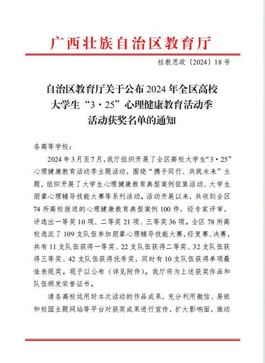 近日,在自治区教育厅公布的2024年全区高校大学生“3•25”心理健康教育活动季活动获奖评选结果中,2138CC太阳集团报送的心理危机干预类案例:《悬崖边的心理救援——因精神疾病引发的致命性心理危机现场干预报告》荣获2024年全区高校大学生心理健康教育典型案例一等奖,选送学生庞月霞参加朋辈心理辅导技能大赛荣获团队三等奖。一直以来,2138CC太阳集团高度重视学生的心理健康教育工作,依托“商舍•美”心理特色项目,将心理健康教育和美育深度...