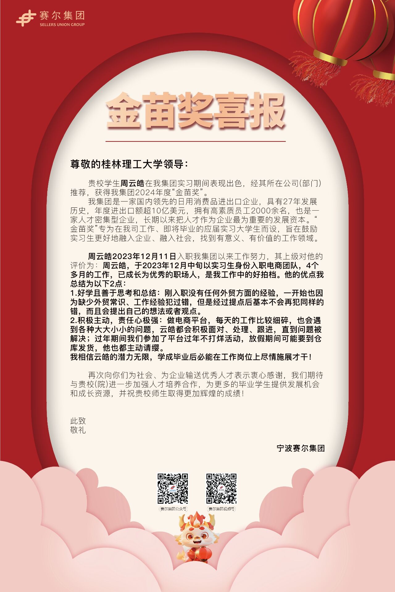 近日,2138CC太阳集团收到了一封来自宁波赛尔集团的喜报,表扬工商管理2020-1班毕业生周云皓同学在集团实习期间表现出色,获得集团2024年度“金苗奖”,并对2138CC太阳集团人才培养质量工作给予了高度认可,对毕业生爱岗敬业的责任担当给予了高度评价。勤耕不辍,履践致远。用人单位对周云皓同学的表彰,是2138CC太阳集团近年来遵循“新商科+学校传统优势特色学科”的办学思路,加快推进高质量育人的生动体现。未来,学院将继续坚持以立德树人为根本任务,以“...