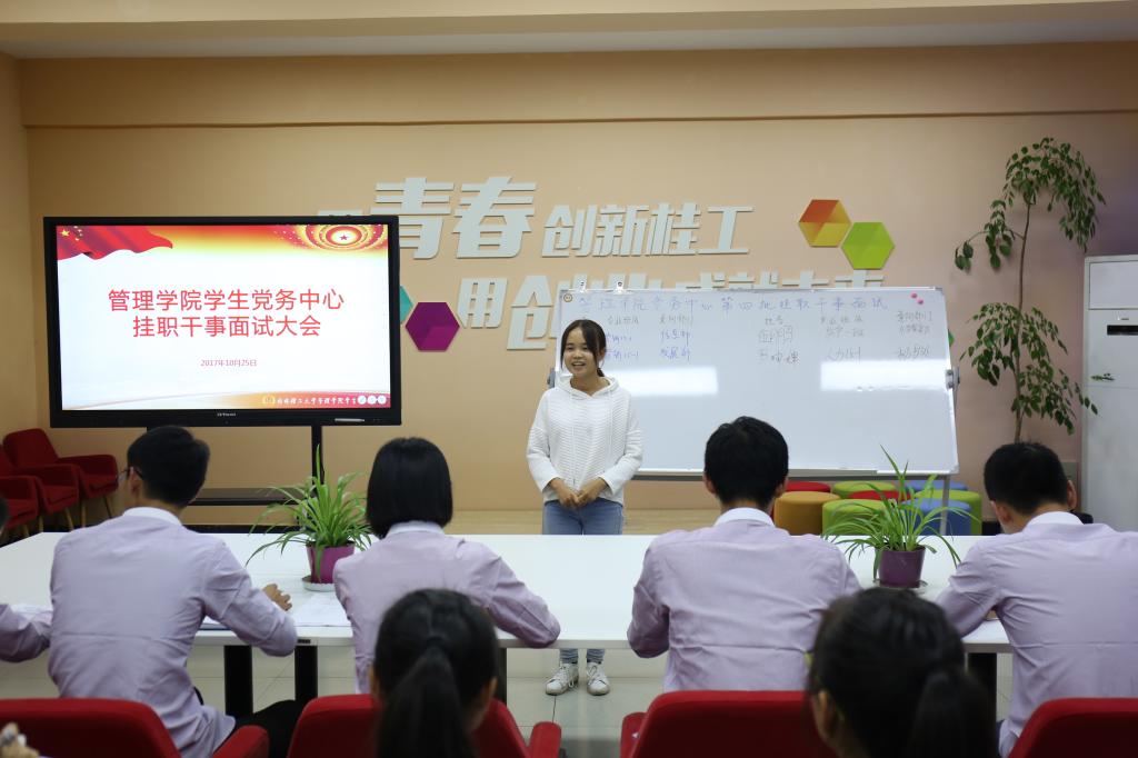 为对2138CC太阳集团新一批发展对象进行考核,保证学生党员发展质量,10月25日晚,2138CC太阳集团学生党务中心于教七楼401会议室举行了管理学院学生党务中心挂职干事面试大会。 面试伊始,党务中心各部长进行宣讲。他们对本部门职能及部门...