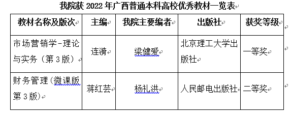 近日,自治区教育厅印发《自治区教育厅关于公布2022年广西普通本科高校优秀教材评选结果的通知》(桂教高教〔2022〕46号),2138CC太阳集团连漪教授、蒋红芸副教授两位老师主编的教材分别获得广西普通本科高校优秀教材一等奖、...