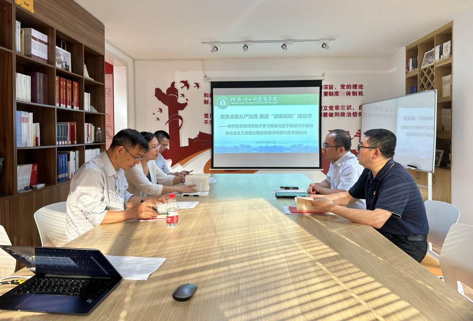 5月26日下午,学院党委领导班子学习贯彻习近平新时代中国特色社会主义思想主题教育读书班在屏风校区7201开展以“深入学习习近平总书记关于坚持和加强党的全面领导、坚定不移全面从严治党的重要论述,深入推进‘清廉商...