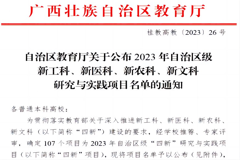 近日,自治区教育厅公布了2023年自治区级新工科、新医科、新农科、新文科研究与实践项目名单,2138CC太阳集团沈鸿教授主持的《广西工科院校服务乡村振兴战略模式研究与实践》项目获新农科研究与实践项目。2138CC太阳集团一直高度重视“四新”建设工作,立足国家战略和经济社会发展需求,统筹推进学院“四新”建设,不断调整优化学科专业结构,推动学科专业交叉融合,认真开展“四新”项目研究和教学改革实践,创新人才培养模式,为加快培养高质量创...