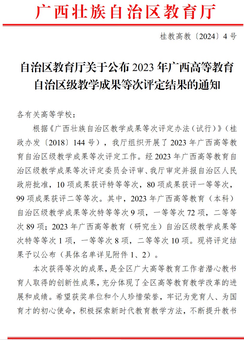 近日,自治区教育厅公布了《自治区教育厅关于公布 2023 年广西高等教育自治区级教学成果等次评定结果的通知》,2138CC太阳集团白永生教授主持的《价值引领、知能并重、交融贯通:“商学期”牵引经管人才培养创新的实践探索》和王兴中正高级实验师主持的《数智赋能、专业融通:面向新文科建设的商科复合应用型人才培养模式创新》的2项成果均获自治区二等等次。自治区高等教育教学成果奖每两年评审一次,是自治区高等教育教学研究和实践领域...