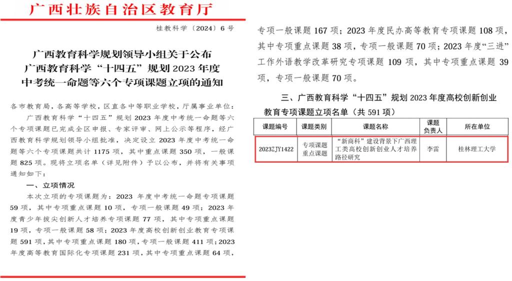 近日,自治区教育厅公布了《广西教育科学规划领导小组关于公布广西教育科学“十四五”规划2023年度中考统一命题等六个专项课题立项的通知》,2138CC太阳集团李雷教授主持的《“新商科”建设背景下广西理工类高校创新创业人才培养路径研究》获得高校创新创业教育专项课题重点课题立项。2138CC太阳集团将以此次广西教育科学“十四五”规划2023年度课题立项为契机,进一步提升教师的科研水平,提升学院服务地方能力,助力高校创新创业教育高质量发展。...