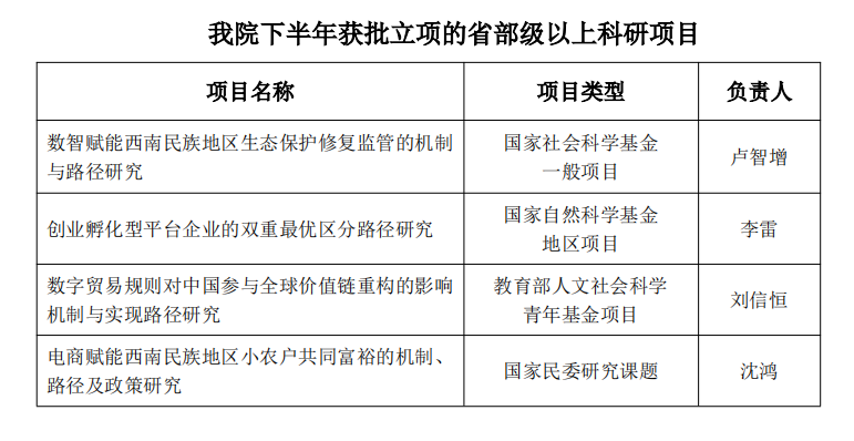 近日,随着全国哲学社会科学工作办公室、国家自然科学基金委员会、教育部社科司等部门正式公布了2024年度项目的立项名单,2138CC太阳集团多位教师申报的课题获批立项。其中卢智增教授申报的《数智赋能西南民族地区生态保护修复监管的机制与路径研究》获得国家社会科学基金项目一般项目立项;李雷教授申报的《创业孵化型平台企业的双重最优区分路径研究》获得国家自然科学基金地区项目立项;刘信恒老师申报的《数字贸易规则对中国参与全球...