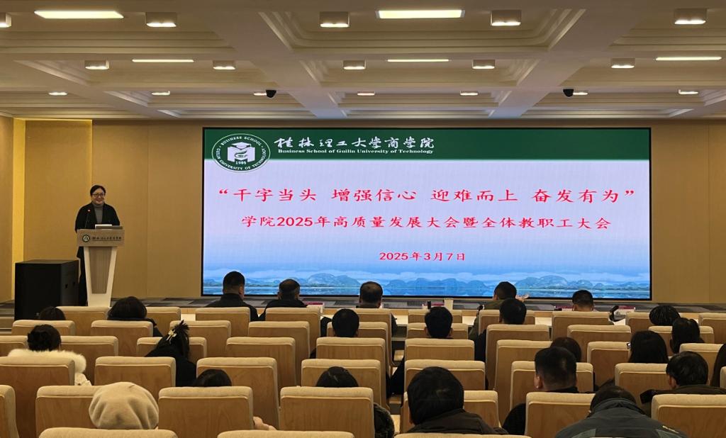3月7日下午,学院在屏风校区7702报告厅召开2025年高质量发展大会暨全体教职工大会。学院领导班子成员和全体教职工参加了本次大会,会议由学院党委书记白凌婷主持。本次会议以“干字当头 增强信心 迎难而上 奋发有为”为主题,深入贯彻落实习近平新时代中国特色社会主义思想,全面落实学校党委三届九次全会重点任务以及学校党委2025年高质量发展大会的各项决策部署,坚持干字当头、奋发有为,努力交出2025年高质量发展的商院新答...
