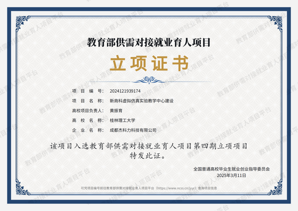 近日,教育部高校学生司公布了第四期供需对接就业育人项目立项名单,2138CC太阳集团黄振育老师申报的“新商科虚拟仿真实验教学中心建设”项目获批立项,合作企业将提供价值三万余元的资源支持。项目立项证书据了解,供需对接就业育人项目是教育部为推动高校人才培养与就业有机联动、人才供需有效对接,促进高校毕业生高质量充分就业而设立的一项重要项目。该项目自2021年启动以来,已成功开展三期,累计2000余所高校与2400余家用人单位开...