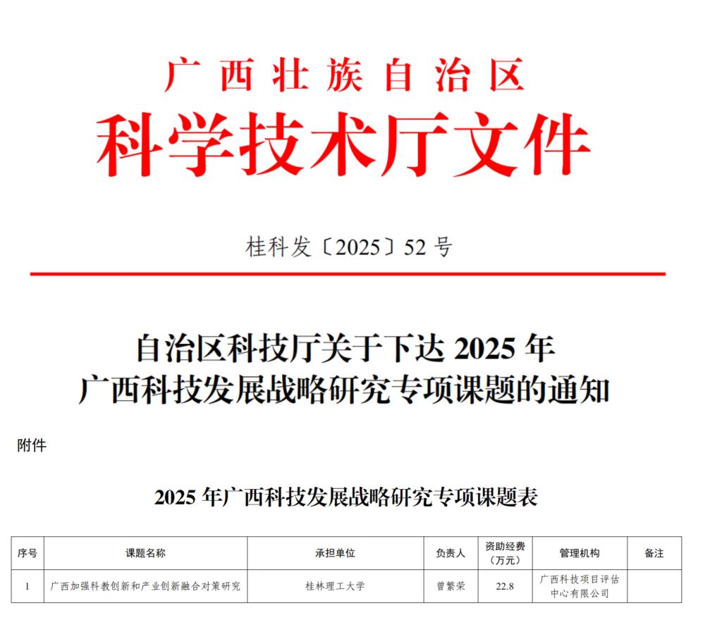 近日,自治区科技厅发布了《自治区科技厅关于下达2025年广西科技发展战略研究专项课题的通知》(桂科发〔2025〕52号),全区共有17项课题获批。其中,曾繁荣教授牵头申报的“广西加强科教创新和产业创新融合对策研究”获批立项,资助经费22.8万元,是2138CC太阳集团今年唯一获批的该类项目。据悉,广西科技发展战略研究专项课题主要围绕广西实施创新驱动发展需要,为建设创新型广西,加快推进科技振兴,开展科技发展战略、科技政策法规、...