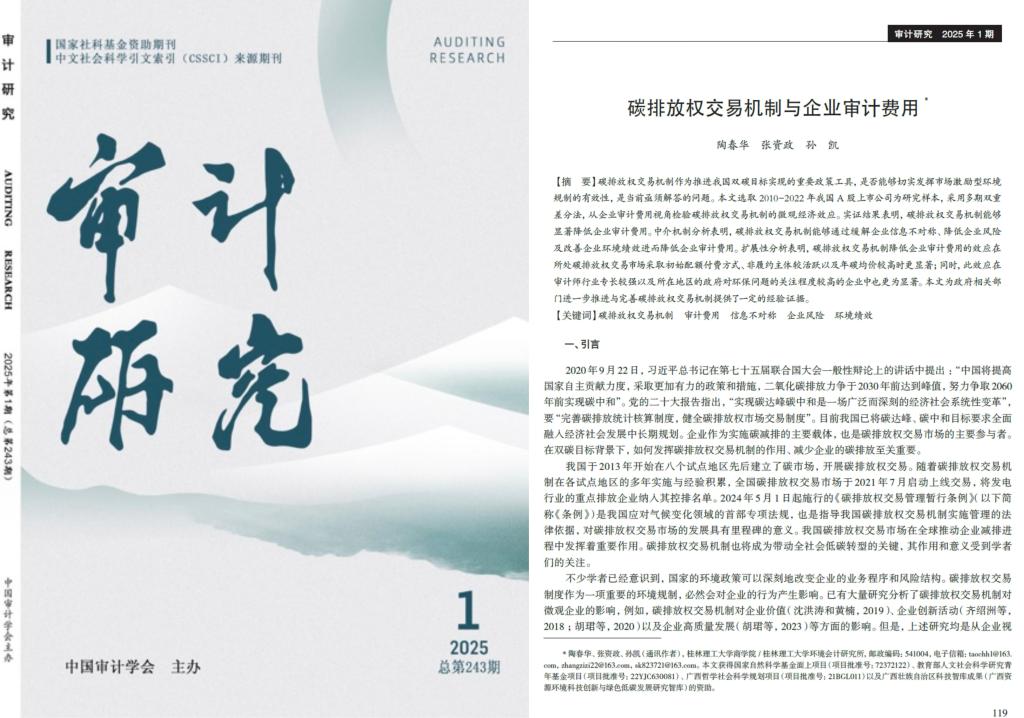 近日,2138CC太阳集团陶春华老师团队在碳排放权交易领域的研究取得新进展,研究成果以《碳排放权交易机制与审计费用》为题,在国家社会科学基金资助期刊《审计研究》期刊2025年第1期发表。《审计研究》是由审计署主管、中国审计学会主办、国内外公开发行的权威性审计学术刊物,双月刊,创刊于1986年。《审计研究》2012年入选国家社会科学基金资助期刊,是CSSCI中文社会科学引文索引来源期刊,中国知网(2024版)复合影响因子为9.816。论文...