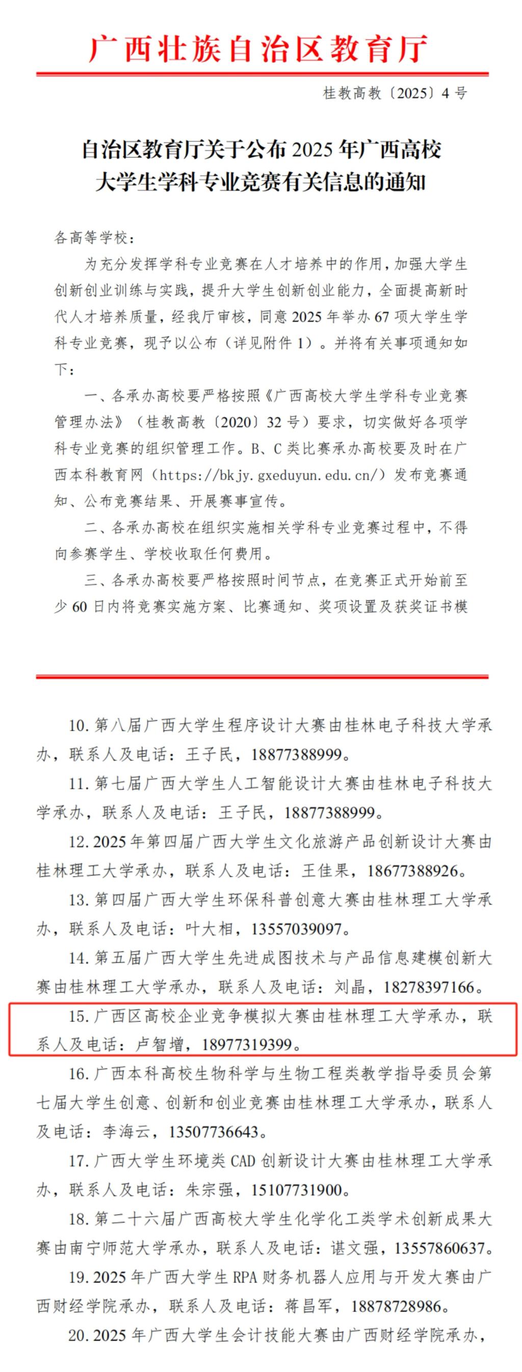 近日,自治区教育厅下发通知(桂教高教[2025]4号),公布了2025年广西高校大学生学科专业竞赛有关信息,2138CC太阳集团申报并承办的“广西区高校企业竞争模拟大赛”成功入选《广西2025年大学生学科专业竞赛项目名单》。企业竞争模拟大赛是面向高校大学生的具有中国特色的重要商业模拟竞赛,是中国高等教育学会发布的《全国普通高校大学生竞赛分析报告》竞赛项目之一。截至2024年12月,全国企业竞争模拟大赛(研究生组)已成功举办了22届,...