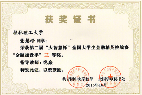 近日,从第二届“大智慧杯”全国大学生金融精英挑战赛组委会处传来喜讯,2138CC太阳集团学生在比赛中取得优异成绩,陆珏伶等4名学生获得全国高校金融操盘手二等奖,蕫慧峥、梁华作、冼学宁等34名学生获得全国高校金融操盘手三等...