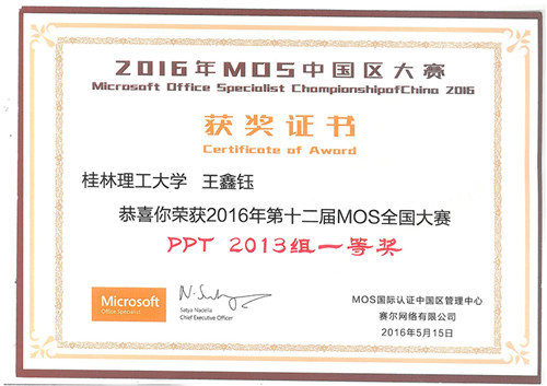5月13日-5月15日,由微软中国(Microsoft)、培生(Pearson)、赛尔网络(CERNET)联合主办的2016年第十二届世界MOS大赛中国区总决赛在北京隆重举行。本次大赛按照office 2010和2013两个版本分为六个科目对参赛选手M...