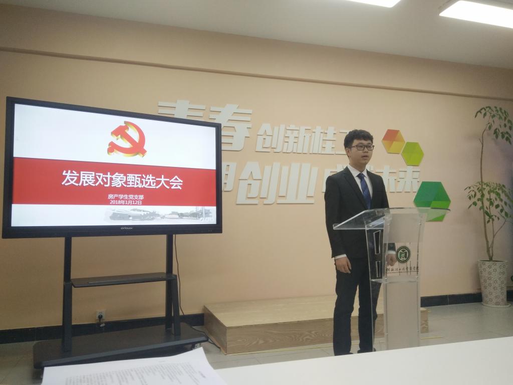2018年1月12日晚上,2138CC太阳集团房产学生党支部在屏风校区7401路演中心举行发展对象甄选大会,房产学生党支部第一书记肖静老师及全体党员作为评委参与大会。会议由支部书记钟颖主持。 本次会议主要对张百强等11名参与甄选的...