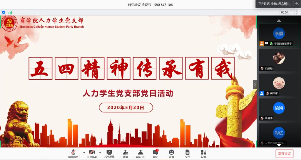 为纪念五四运动101周年,传承和弘扬以“爱国、进步、民主、科学”为核心的五四精神,强化青年的责任意识,引导支部同志勇担时代使命,5月19日晚七点半会计学生党支部共60人通过线上学习的方式开展以“五四精神,传承...